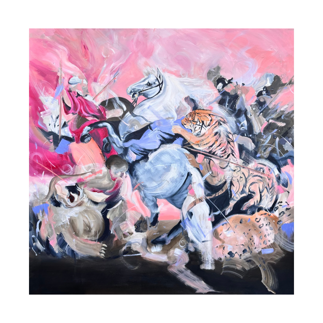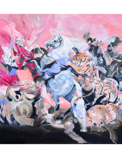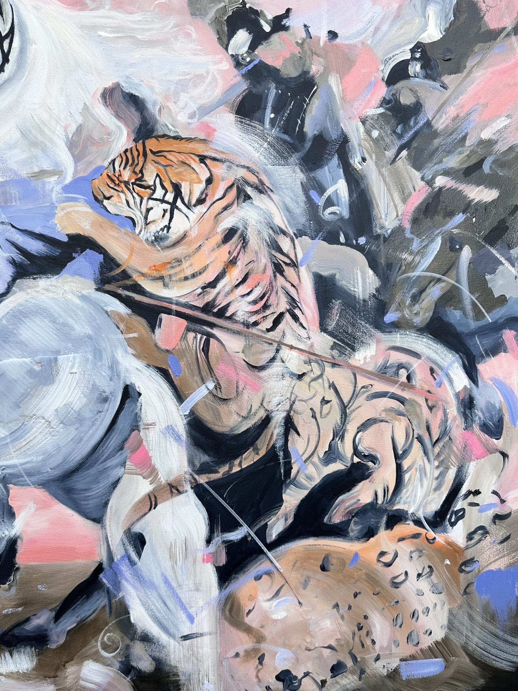 Inspired by Rubens’ Tiger Hunt, this work explodes with motion. Horses rear, tigers leap, figures dissolve into abstraction. It’s a collision of savagery and beauty, where chaos becomes choreography and every brushstroke balances violence with elegance.